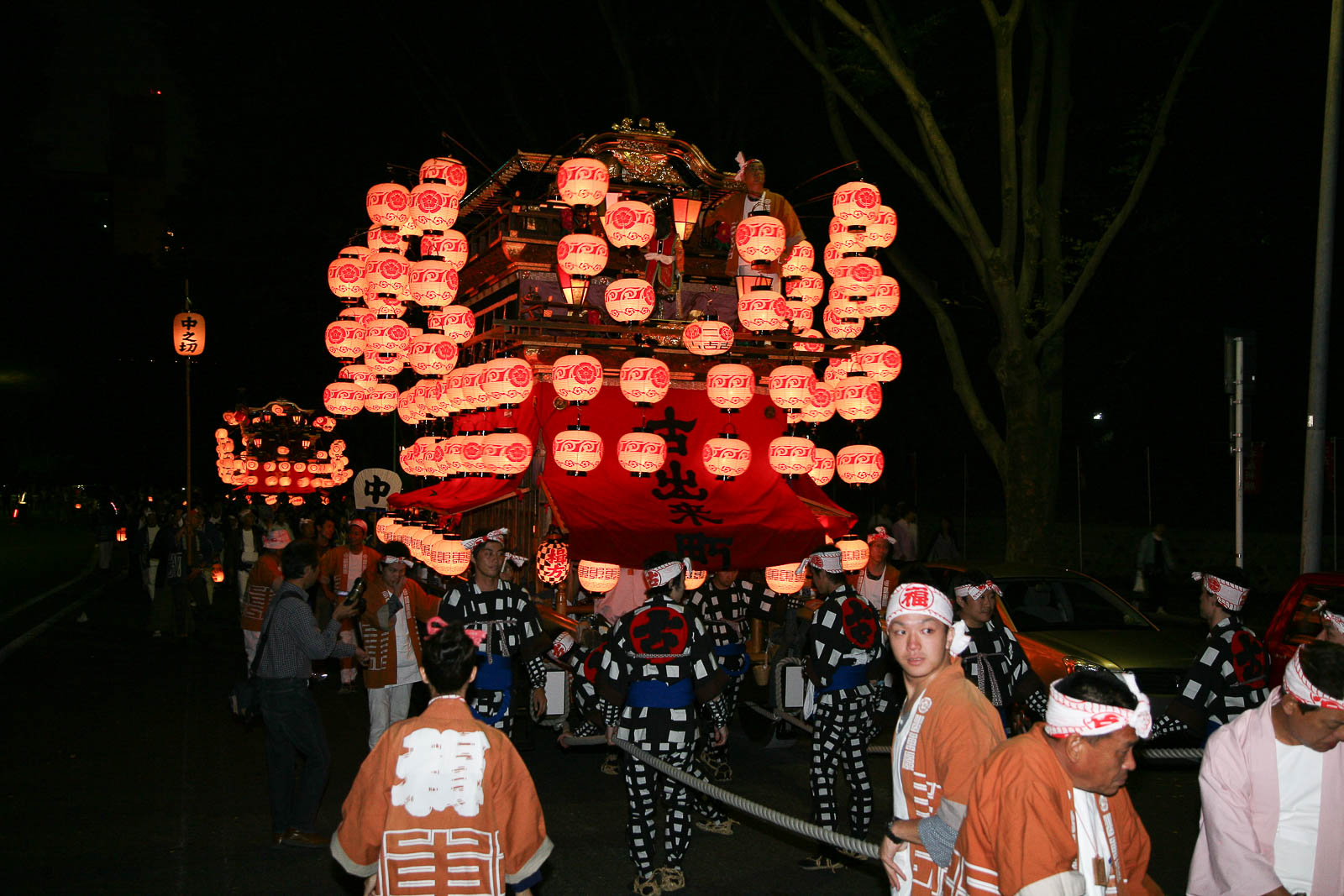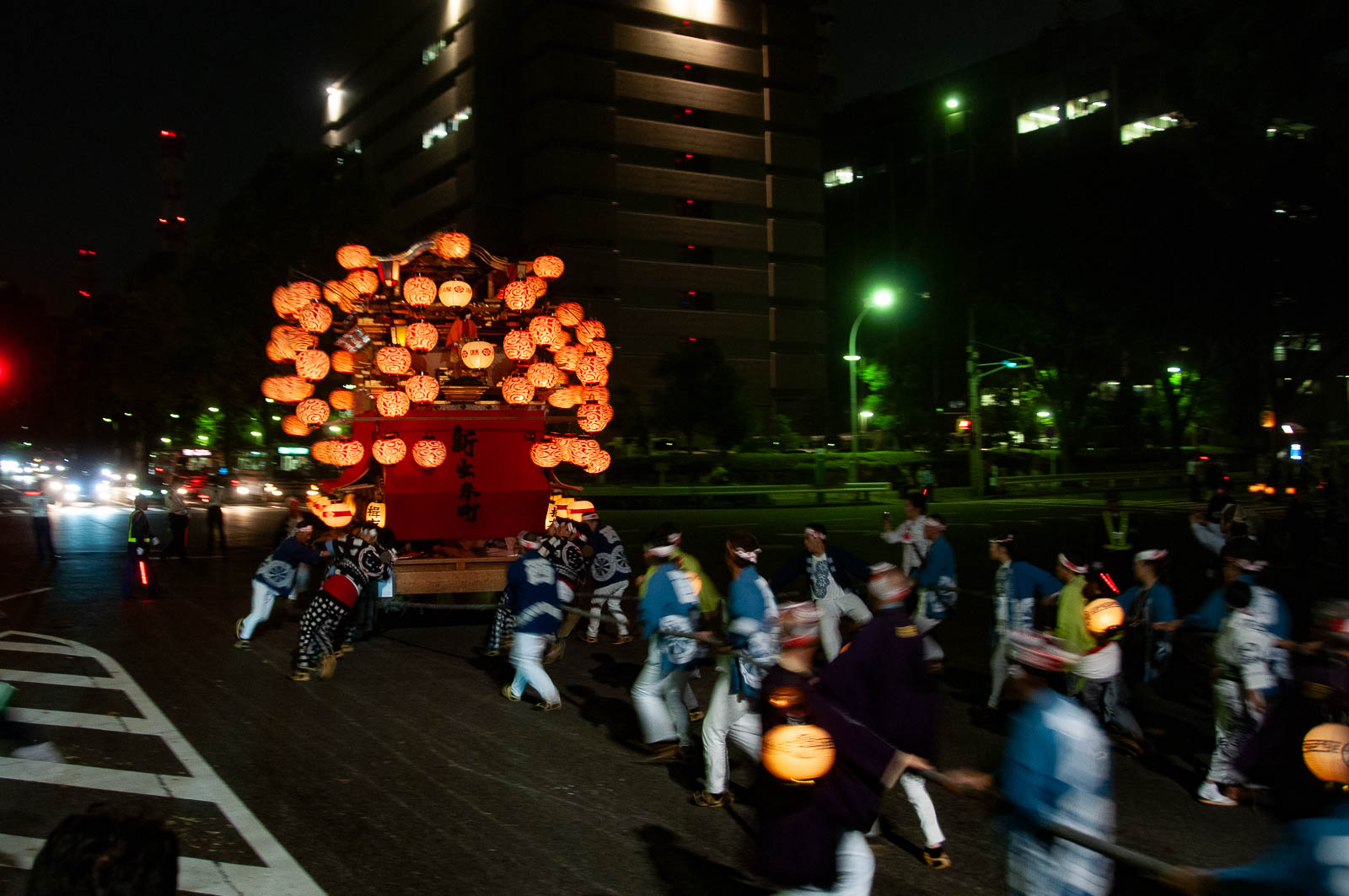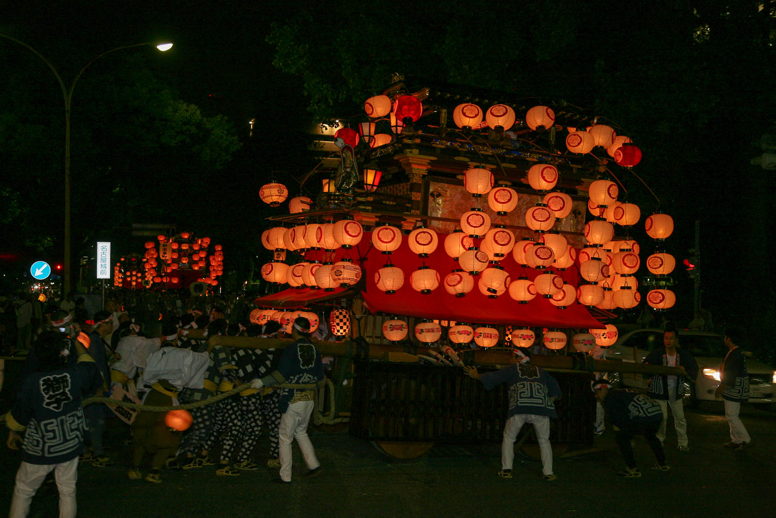 那古野神社の奉納を終えた山車は、提灯を揺らしながら本町通を北上し、本町橋を渡って本町御門をくぐる。