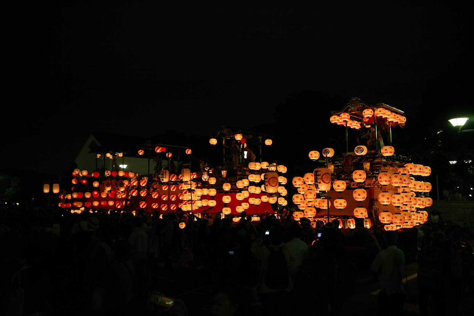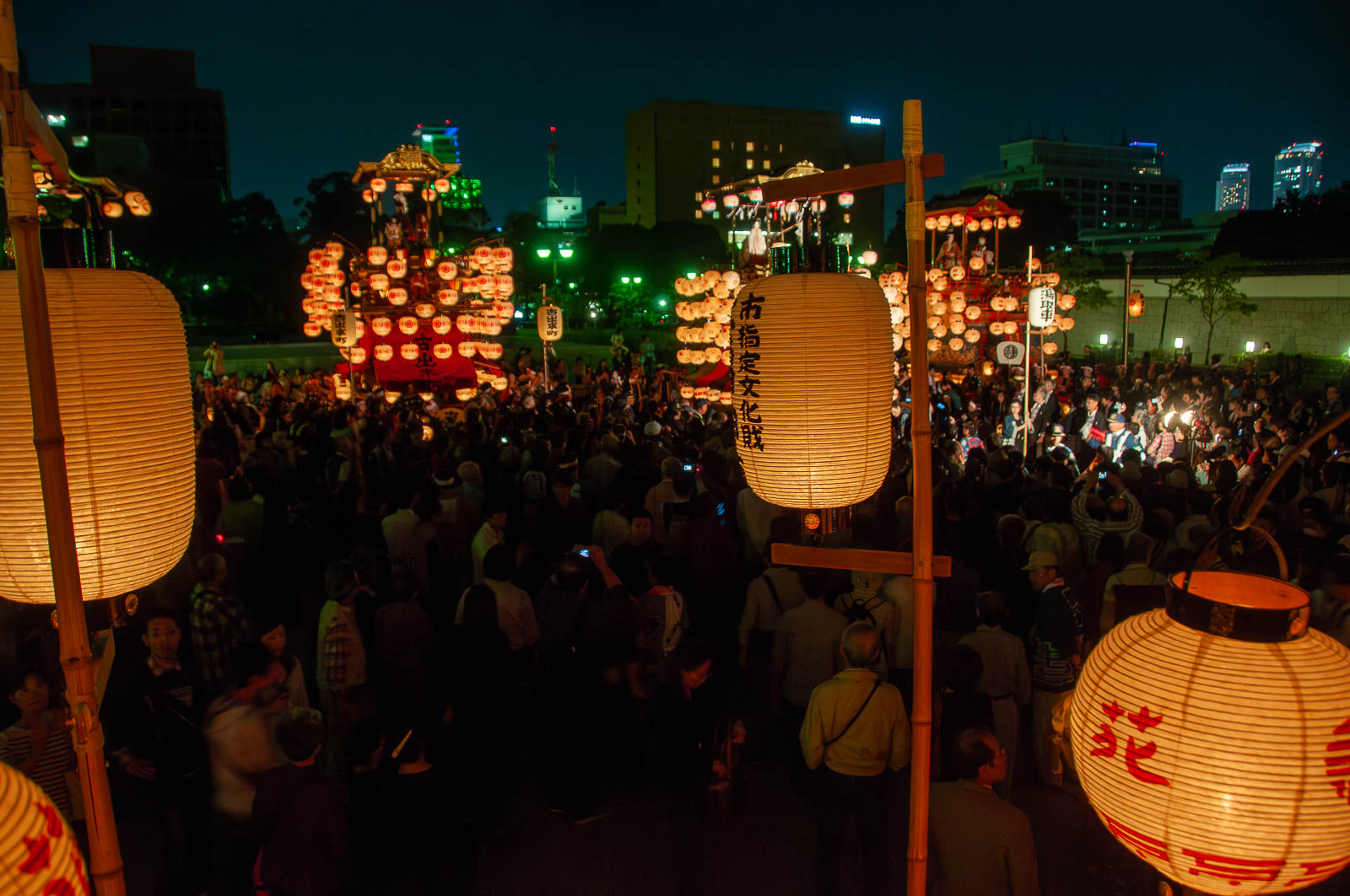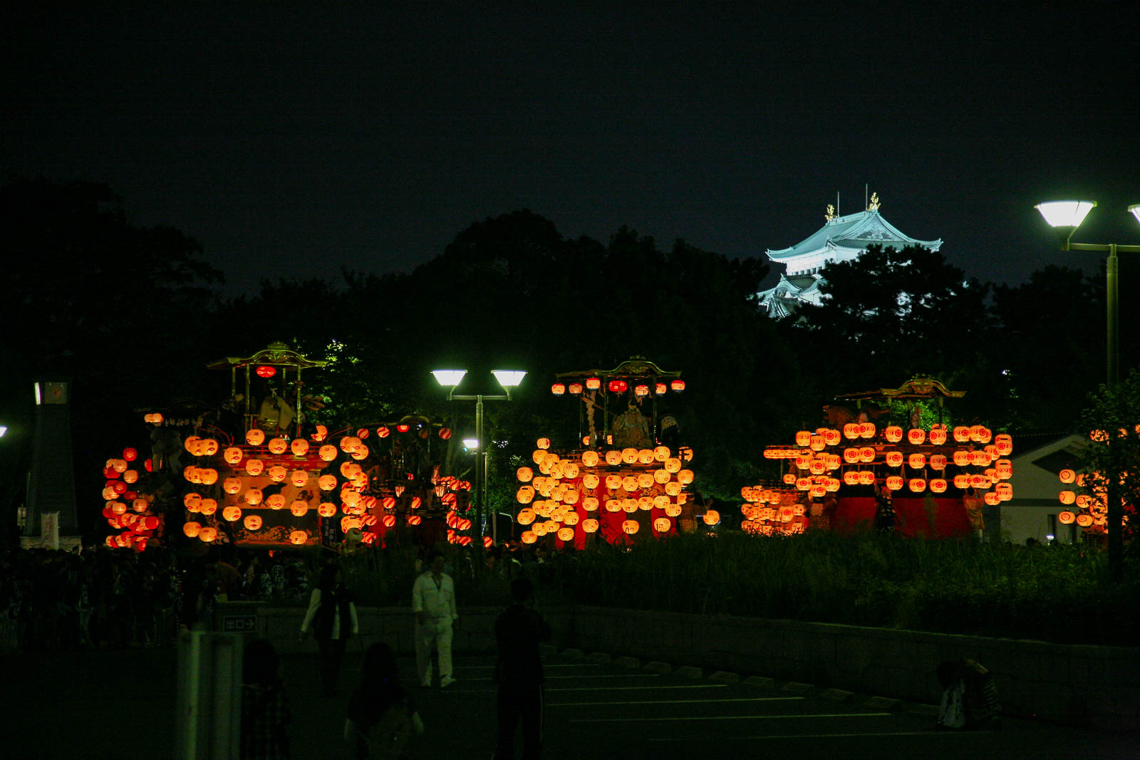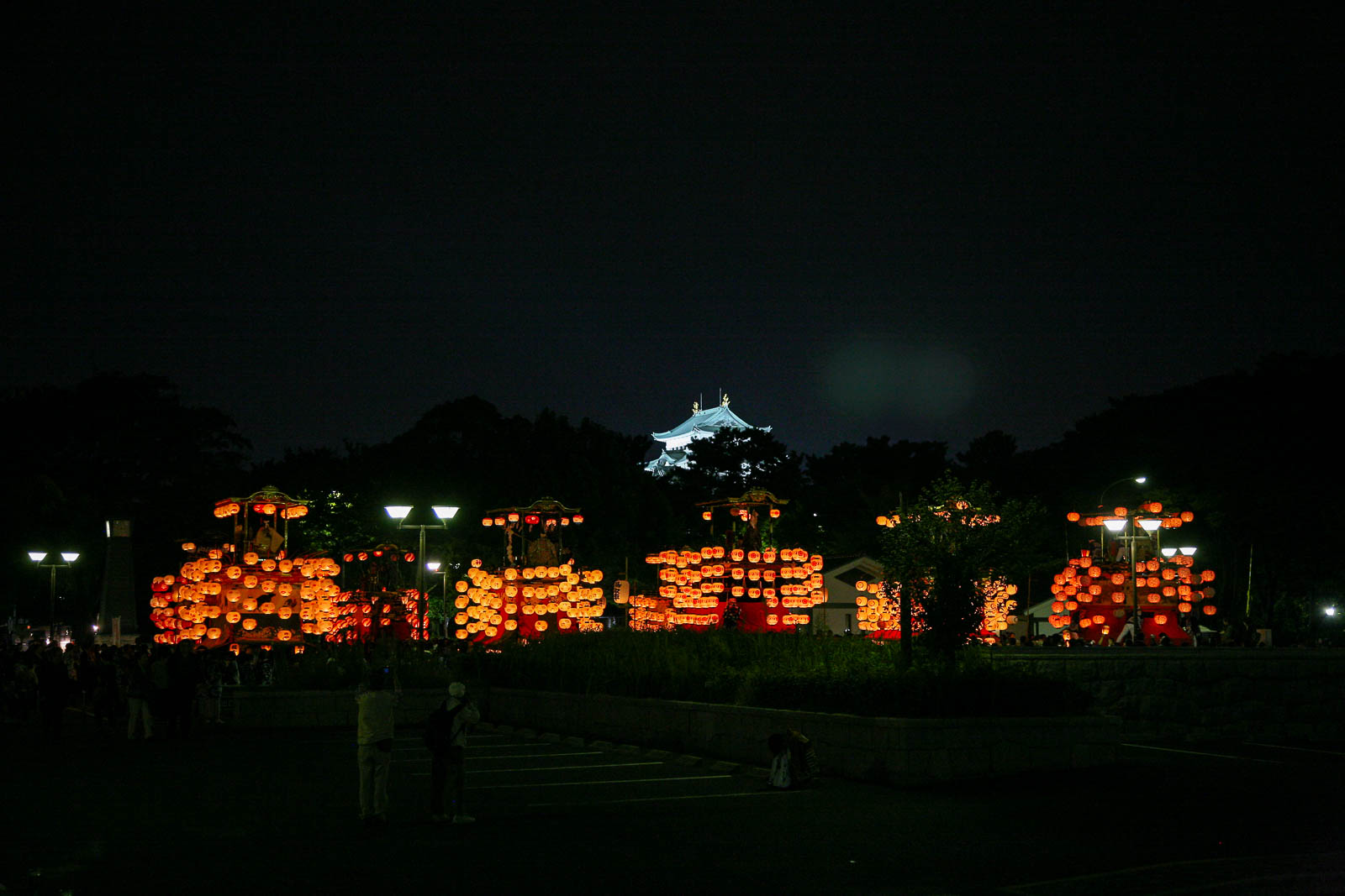 山車群の後方にライトアップされた名古屋城天守閣(H)