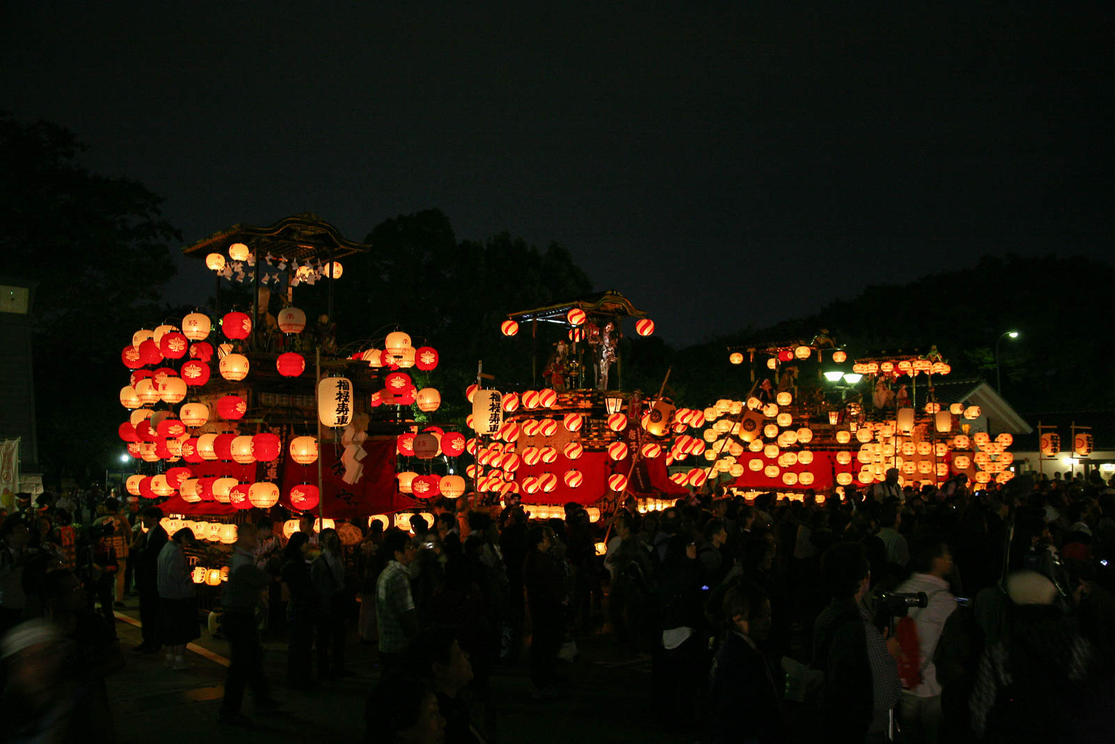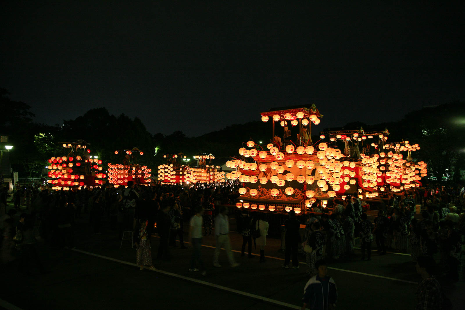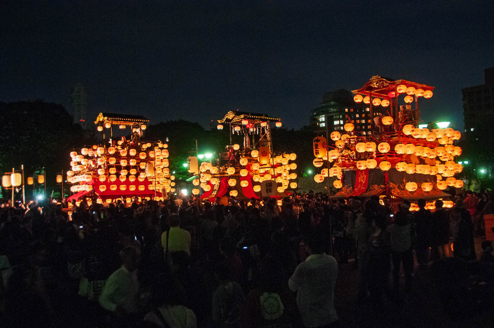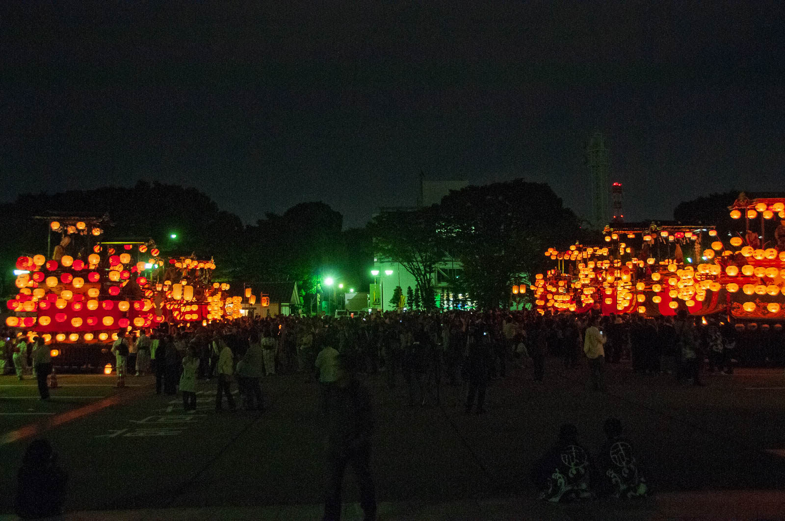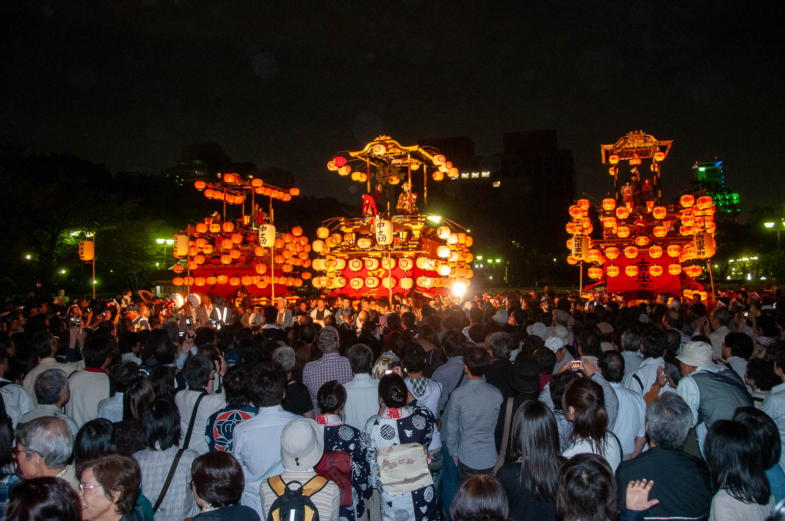 山車群の後方にライトアップされた名古屋城天守閣(H)