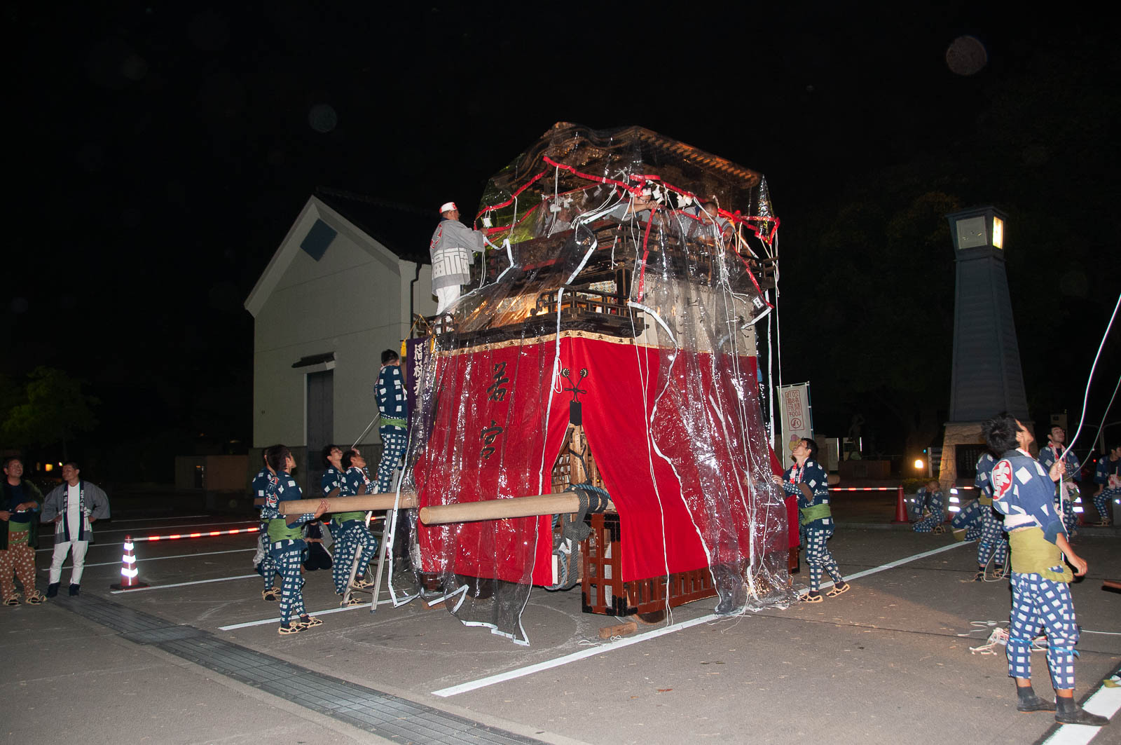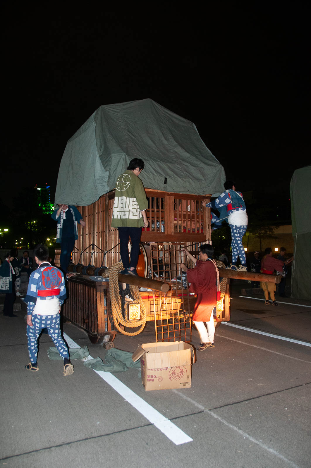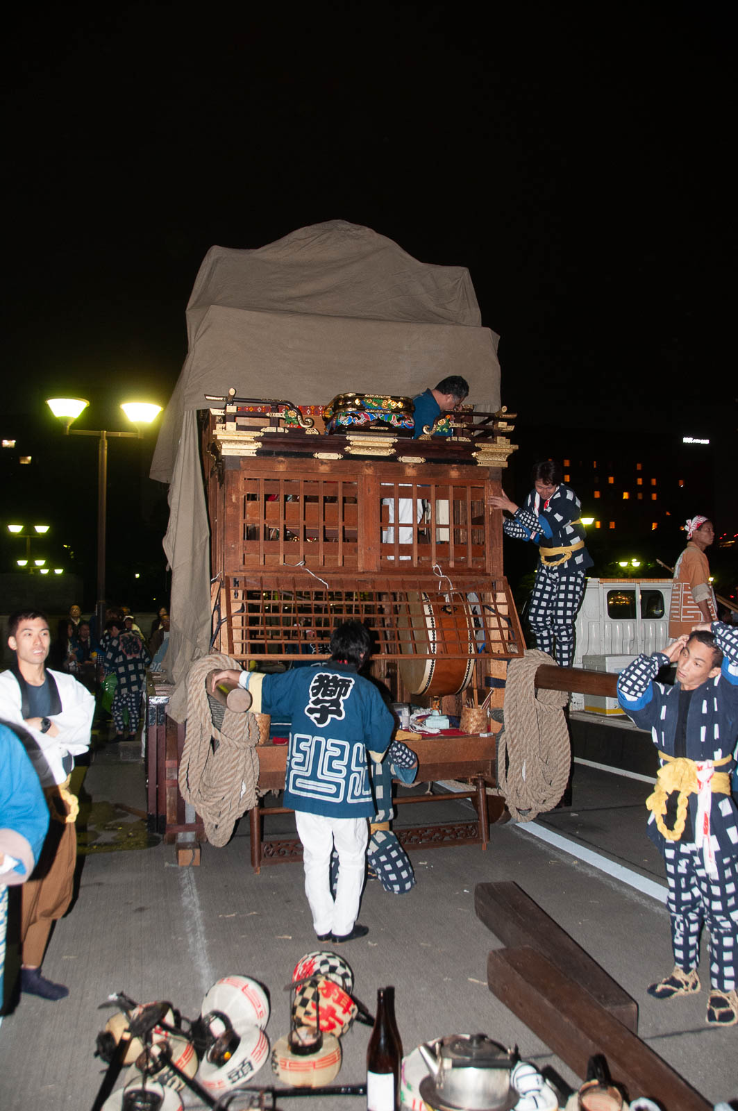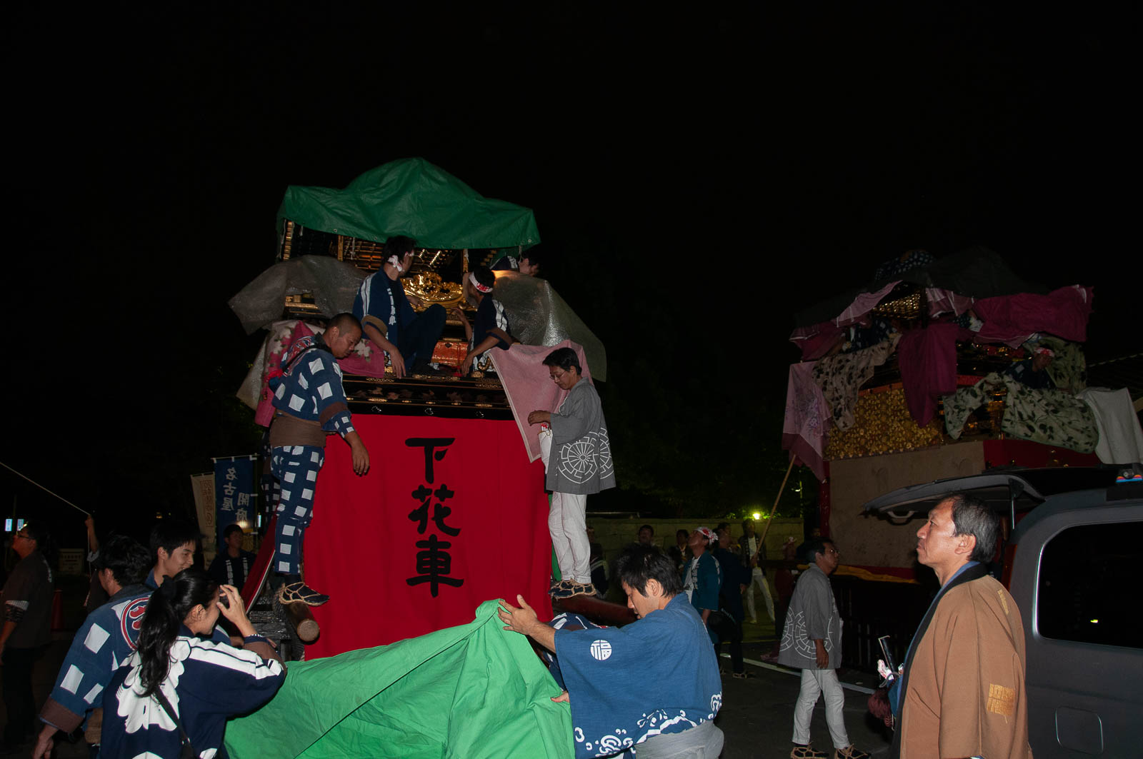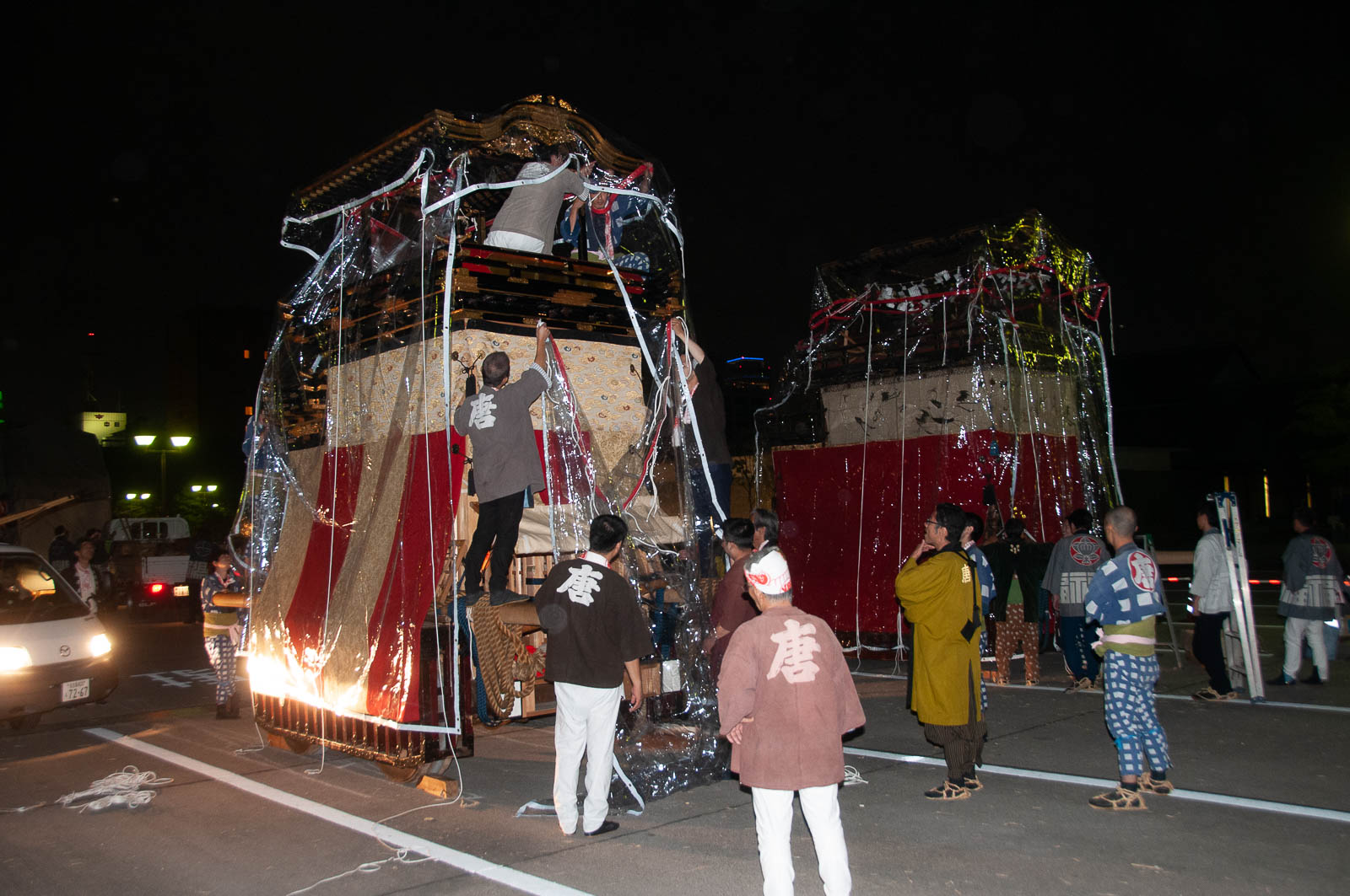 雨の心配はないようだが、夜露をしのぐために、シートを掛ける作業が各山車で行われていた。