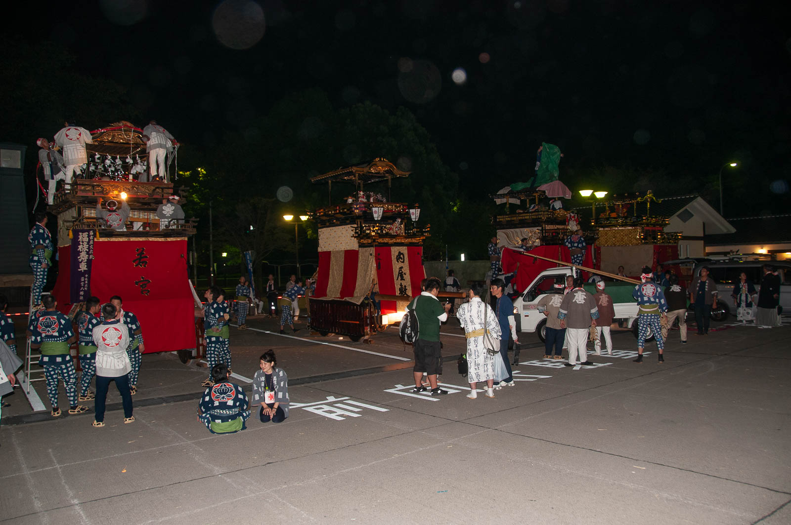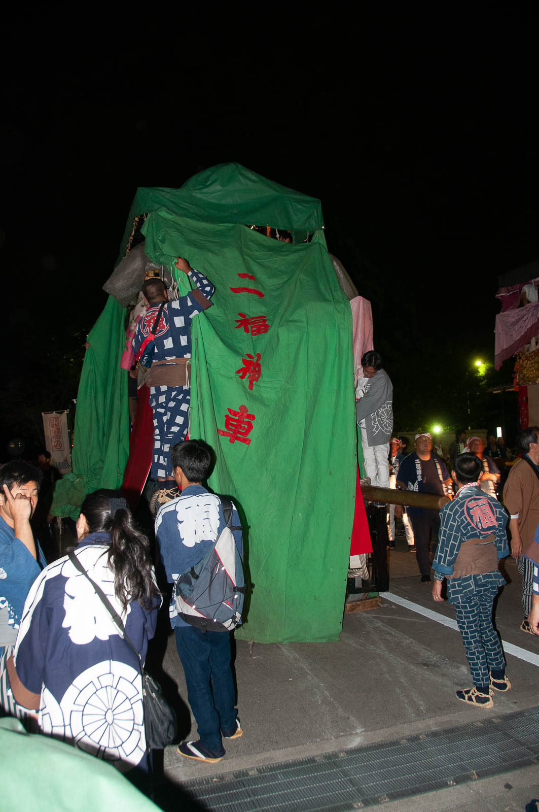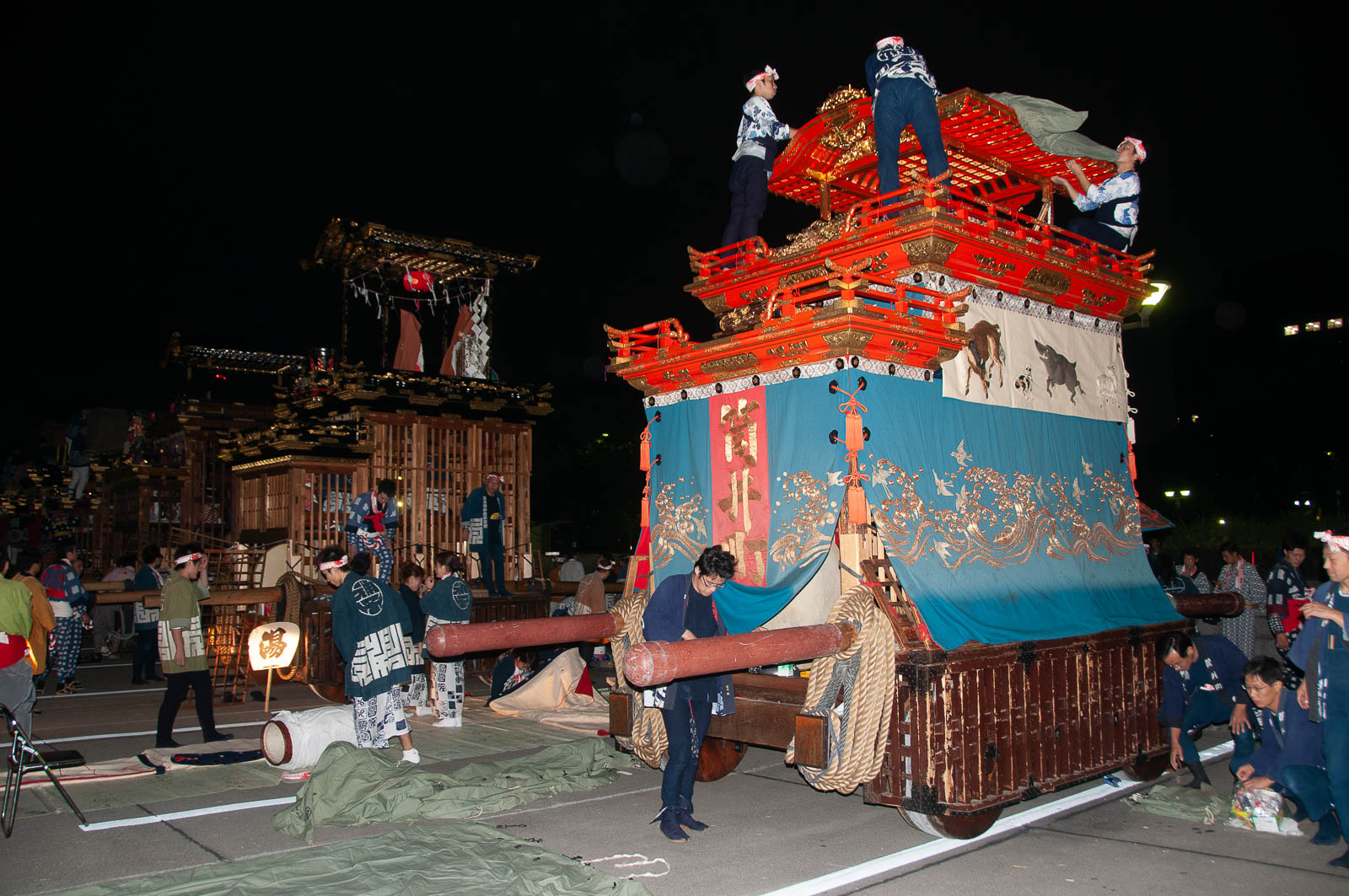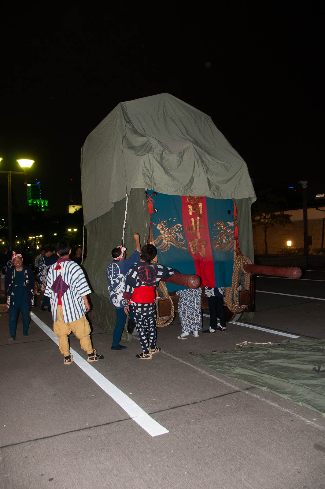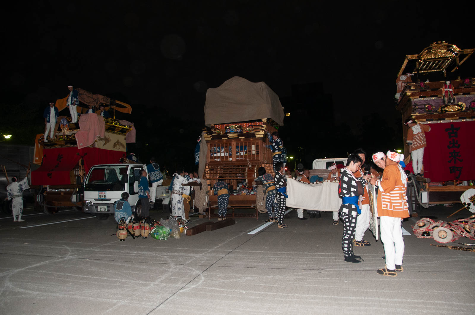 雨の心配はないようだが、夜露をしのぐために、シートを掛ける作業が各山車で行われていた。