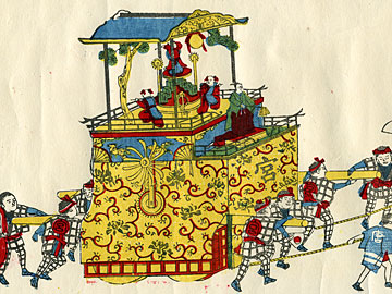 ※名古屋城築城の時熱田から大石を引いた光景をうつしたもの。大きな石の作り物の上に六十斗りの男が柿色棒縞の殿中羽織に立附袴を着て麾を持った平岩主計頭(或は加藤清正と云う)の人形を一人立たせ石には紅白打交の縄をかけ、大勢の若者は木遣り小唄節を唄ってやろゑいやろゑいと勇ましく引いた。
